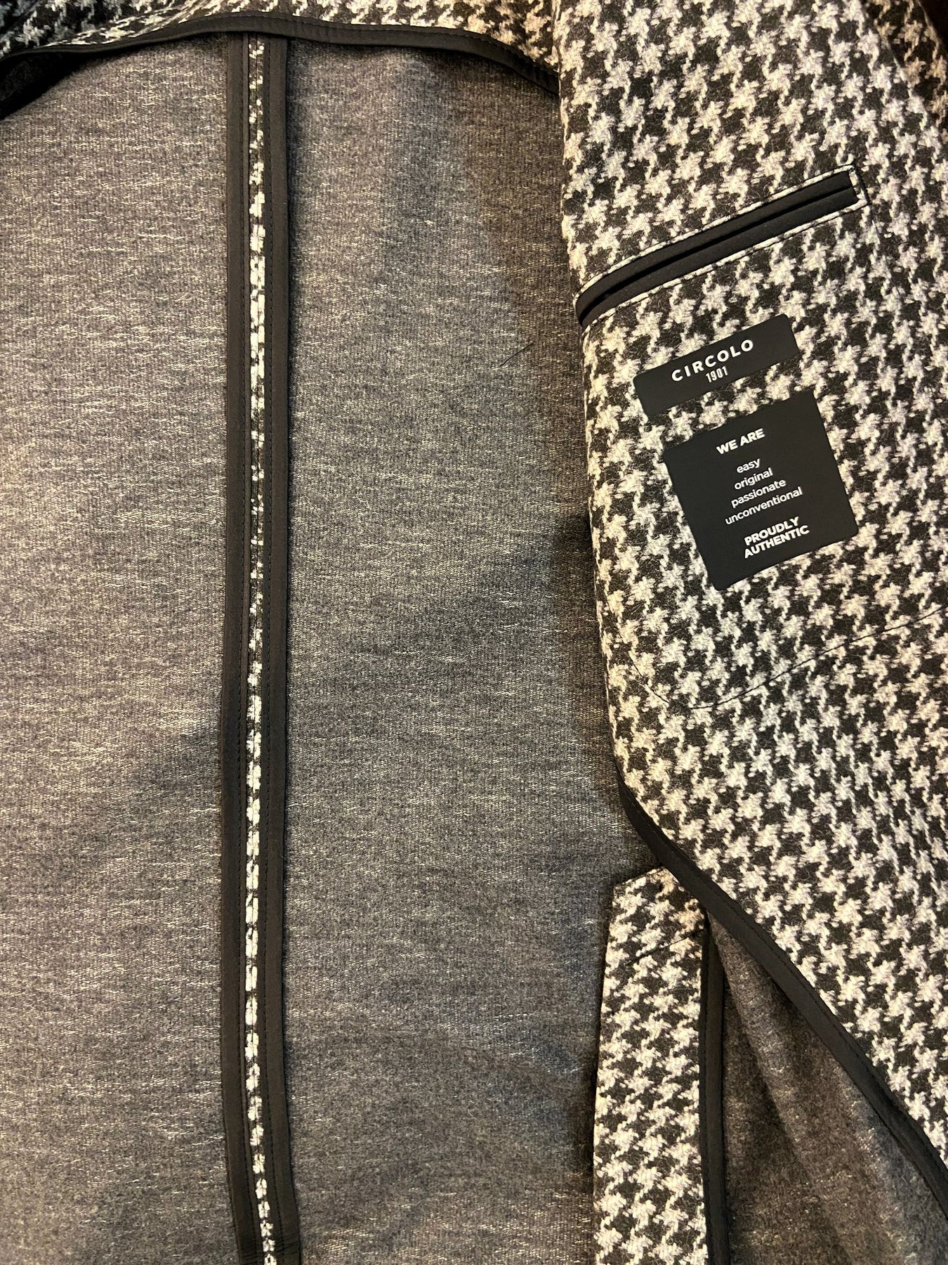 Giacca in Jersey elasticizzatoRevers classico con occhielloChiusura due bottoni in cornoPolsini con bottoniDue tasche a toppa e una a filoDoppio spacco posterioreComposizione: 97% Co – 3% Ea