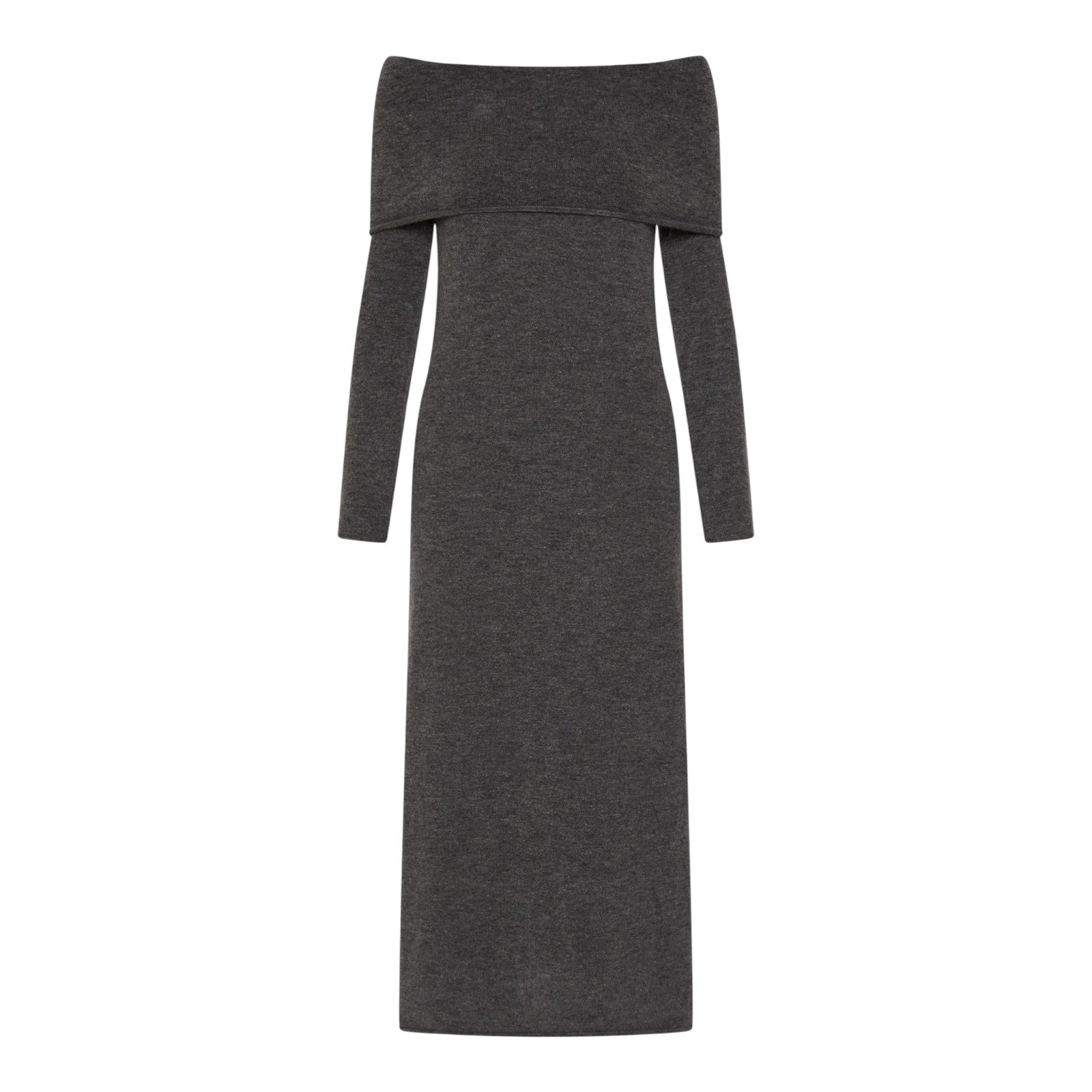 Naturalmente aderente, l'abito in maglia si arricchisce di uno scenografico sollo ad anello, che lascia scoperte le spalle. Da completare con stivali e pochette morbida.