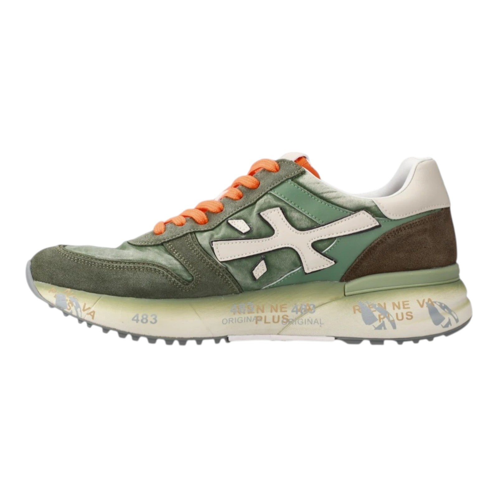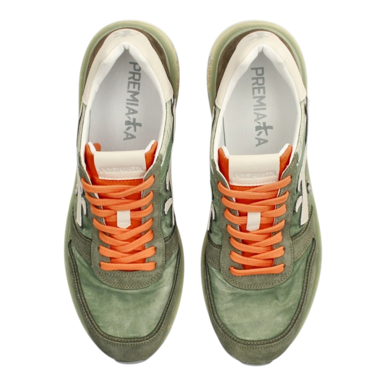 Ein Mix aus hochwertigen Materialien und Leder. Der Schuh ist in Grüntönen gehalten und sorgt für einen lässigen Stil. Die ikonische Silhouette wird durch das Premiata-Logo bereichert.