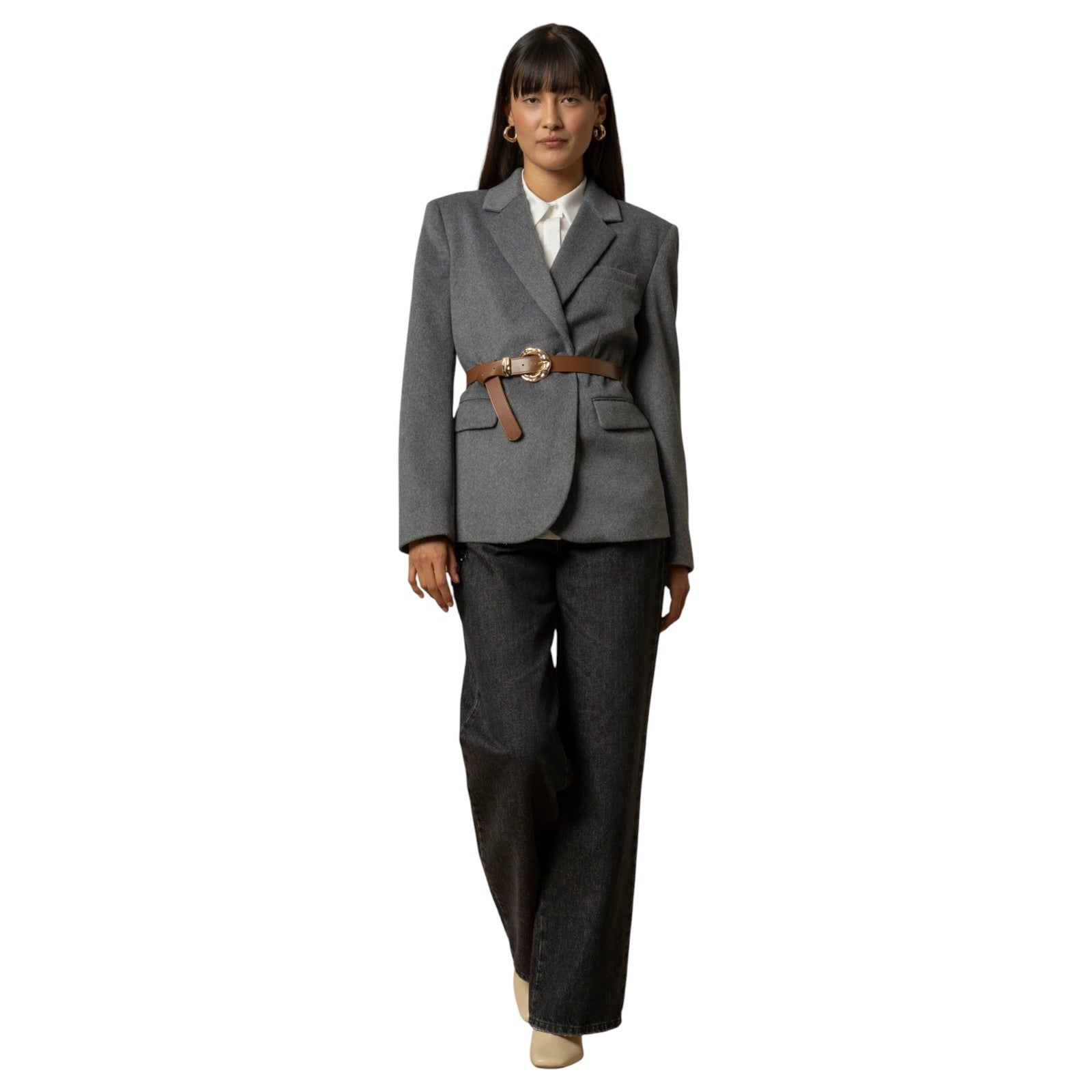 Una cintura con fibbia dorata impreziosisce lo stile essenziale di questo cappotto corto caratterizzato dallo scollo con revers, tasche con pattina e chiusura con due bottoni in tessuto tono su tono.